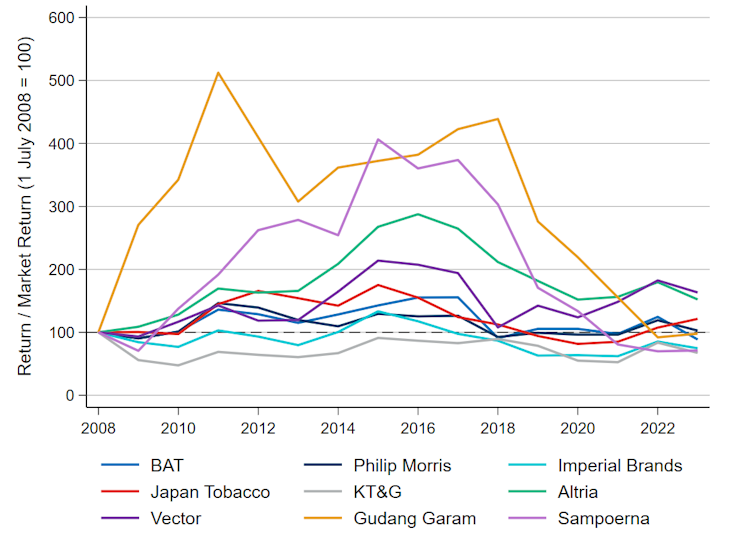 Since 2016, however, all nine tobacco companies’ stocks analysed have performed worse than the market.